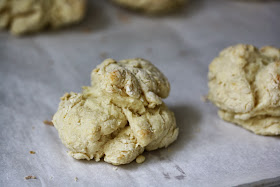 Divide dough into 12 balls. (It's ok if the dough doesn't stick together really well. Mine didn't and the biscuits turned out just fine.) If you're making the chicken pot pie for later, bake biscuits on prepared baking sheets for 10 minutes, rotating sheets halfway through. Biscuits will be pale, like in the picture below. Allow to cool on a wire rack.